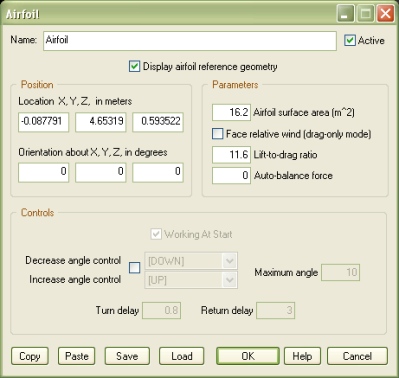 Checking this option helps you see the airfoil reference geometry runtime. This is useful for example when testing airfoils that can be controlled and rotate about their axis. The bigger the airfoil surface, the greater the lift and drag forces produced. Note that lift force is only generated when the angle of attack is below approximately 14 degrees. When this option is checked, no lift forces are produced. The airfoil will only produce drag forces, simulating a generic body with a frontal projection area equal to the airfoil surface area (see above). This feature can be used to simulate air friction more realsitically than simply using RigidBody object's damping parameters. NOTE: when this option is not checked, the Airfoil object still simulates drag forces (besides lift), but only those produced by a flat object like a wing or a sail. The bigger the ratio, the smaller the effect of drag forces on the airfoil. In general, reducing this factor makes a plane less realistic but easier to control. Setting this factor to any non-zero, positive value will automatically apply a force to the object linked to the airfoil (e.g. airplane fuselage) to prevent it from banking/pitching too much. The bigger the value, the stronger the force applied. This option helps you setup aircrafts that tend to fly horizontally and are easier to control. Enabling auto-balance for more than one single airfoil attached to the same aircraft is not recommended. You should only enable auto-balance for one single airfoil per aircraft (usually the main wing). You can make the airfoil interactive by checking the box next to the input controls (Decrease angle control, Increase angle control). This option is typically checked for airfoils that will work as elevators, rudders, ailerons etc. Please note that this option must be unchecked if you want to control the airfoil by manipulating its internal value, for example by using the Script object. See internal values table below for more. Please note that delays should be set to 0.0 if proportional controls are used (see ConfigureControls for details). For information about the remaining controls, please click here. Airfoil is a fantastic asset. However, in order to create systems that work as expected (e.g. a flying plane) it is recommended that you start by using as few airfoils as possible, to keep things simple. To make your own airplanes it is recommended that you use the AircraftDemo.3dr project as basis. This is basically a RigidBody object shaped like a plane. Mass distribtuion and weight are based on a Cessna 170. When using your own RigidBody models, start placing Airfoil objects close to the horizontal plane passing through the center of mass. This should give you a stable setup. You can find the center of mass by right-clicking the RigidBody object in the Vistual Editor, while holding the 'M' key pressed. Launch the project to see if the system can actually fly. If it can you may gradually move airfoils to real positions to reproduce behaviors peculiar to your specific aircraft type. While freely experimenting with Airfoil surface area and lift-to-drag parameters is highly recommended, please keep in mind that you usually get better results by using real airplanes' specifications as a reference. The following internal parameters can be accessed by using other objects like EventOnValue or Script: |