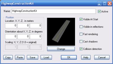 Click the Change button to specify the road element shape. If this option is checked, a faster rendering technique is used. This will improve frame rate on slower systems, but it may reduce rendering quality. Note that on old systems that do not support hardware processed pixel shaders, this modality is automatically used. If this option is checked, the road element will cast a volumetric shadow. This may affect frame rate on slower systems. If this option is checked, the road element will detect collision detection with all rigid-body based objects linked to it. |