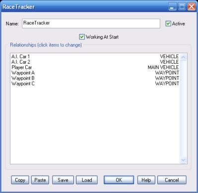 Then, in the RaceTracker's property dialog, set the relationships for all the linked objects.