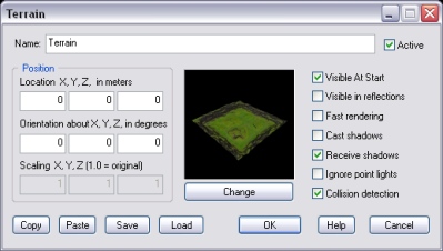 Click the Change button to choose a map among the various that are available. If this option is checked, a faster rendering technique is used. This will improve frame rate on slower systems, but it may reduce rendering quality. Note that on old systems that do not support hardware processed pixel shaders, this modality is automatically used. If this option is checked, the terrain will cast a volumetric shadow. This may severely affect frame rate on slower systems. If this option is checked, the terrain will receive volumetric shadow from other objects (and itself if Cast shadows above must be checked). By default, if point lights are close enough to affect the Terrain object, the surface is affected by them. However, because rendering surfaces that are illuminated by multiple lights require much more processing power, this option allows you to disable this feature to optimize frame-rate. Note that, for each Terrain object, there is a maximum limit of point lights that can affect its surface at any given time. Please see the PointLight object's help file for details. IMPORTANT: point lights with a small range may fail to illuminate terrain surfaces properly, where they are made of big polygons. If this option is checked, the terrain will detect collision detection with all rigid-body based objects linked to it. The following internal parameters can be accessed run-time by using the Script object: |