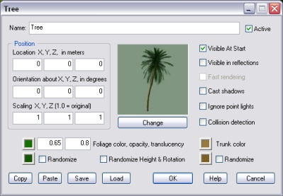 Click the Change button to set the tree type. Unused in this version of the object. If this option is checked, the tree will cast a volumetric shadow. This may affect frame rate on slower systems. By default, if point lights are close enough to affect the Tree object, foliage and trunk are affected by them. However, because rendering surfaces that are illuminated by multiple lights require much more processing power, this option allows you to disable this feature to optimize frame-rate. Note that, for each Tree object, there is a maximum limit of point lights that can affect its surface at any given time. Please see the PointLight object's help file for details. If this option is checked, the tree will detect collision detection with all objects linked to it. Depending on your scene features, foliage opacity should be set to the lowest value possible, in order to minimize transparency sorting artifacts between the several 'surfaces' that form the tree. Zero means 'totally transparent', one means 'fully opaque'. The translucency setting is used to simulate the effect produced by sunlight passing through leaves (backlighting). The value must be between 0 and 1. If randomization is enabled for a color setting, the actual tree tint is randomly set between the two specified colors. The Randomize Height & Rotation only works run-time and will automatically set the tree height to the current vertical scaling plus/minus 10%. It will also set a random orientation around the vertical axis. For information about the remaining controls, please click here. |